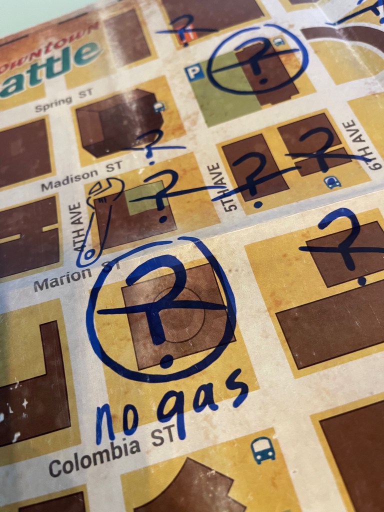 To help me find what I needed, I bought a copy of this amazing map, sold by La Tienda de Kirby on Etsy: it’s an exact replica of the faded city map Ellie uses to navigate her way around the Seattle, complete with Sharpie markings of points of interest.