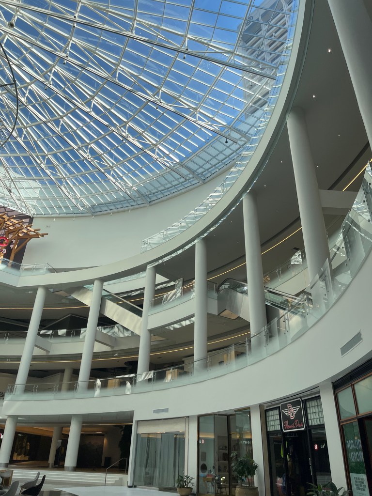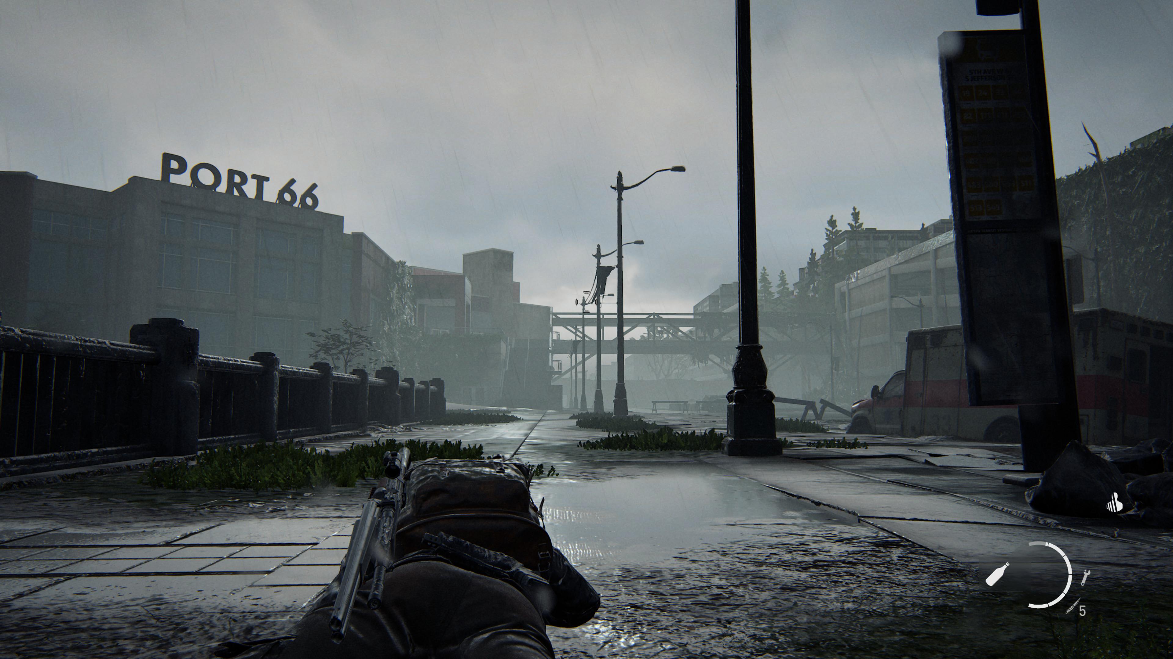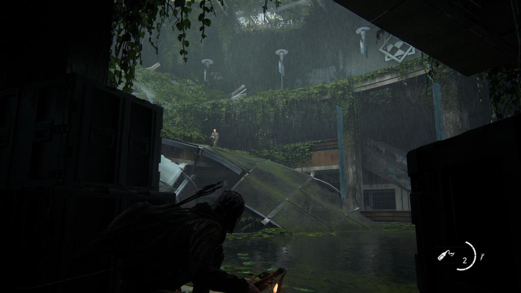 She finds a speedboat after stealthing her way (or slaughtering her way, the player decides) past enemies at an abandoned, flooded mall. This is Seattle’s Pacific Place Mall, recognisable by its glass ceiling.