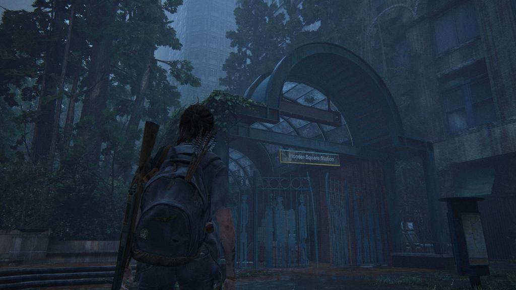 Ellie ascends from the dark dangers of the subway tunnels into daylight, moments before her first encounter with the Seraphites (a faction of religious cultists) and if you turn round, you can see that you’ve been down in Pioneer Street Station.