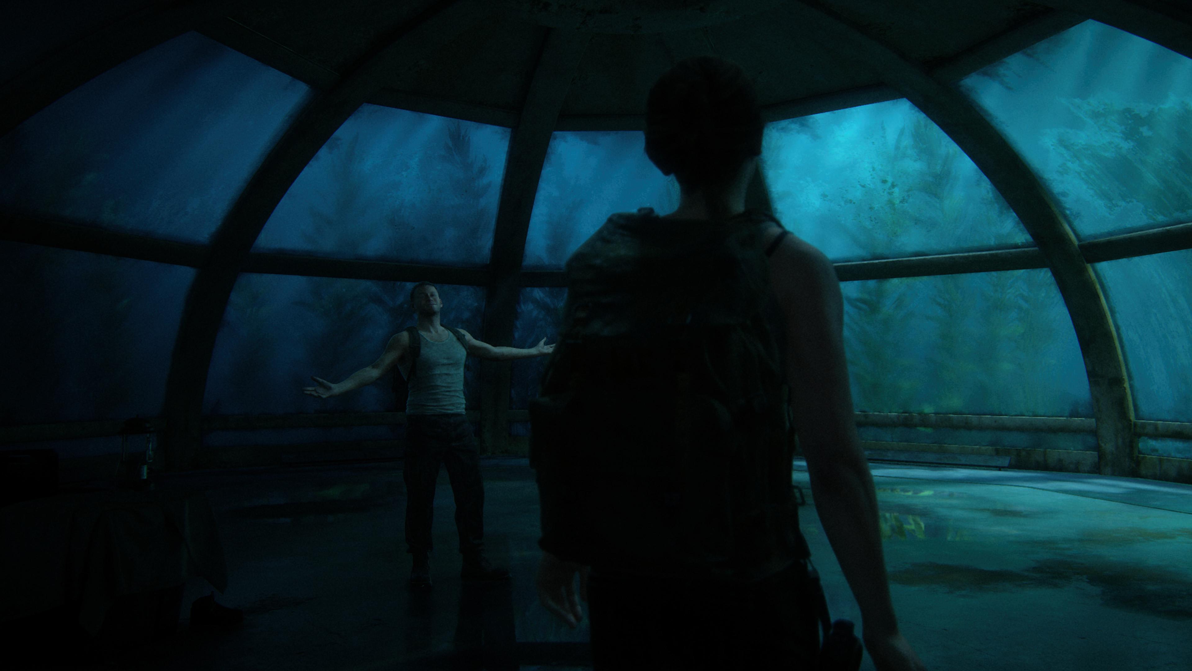 She finds a speedboat after stealthing her way (or slaughtering her way, the player decides) past enemies at an abandoned, flooded mall. This is Seattle’s Pacific Place Mall, recognisable by its glass ceiling.